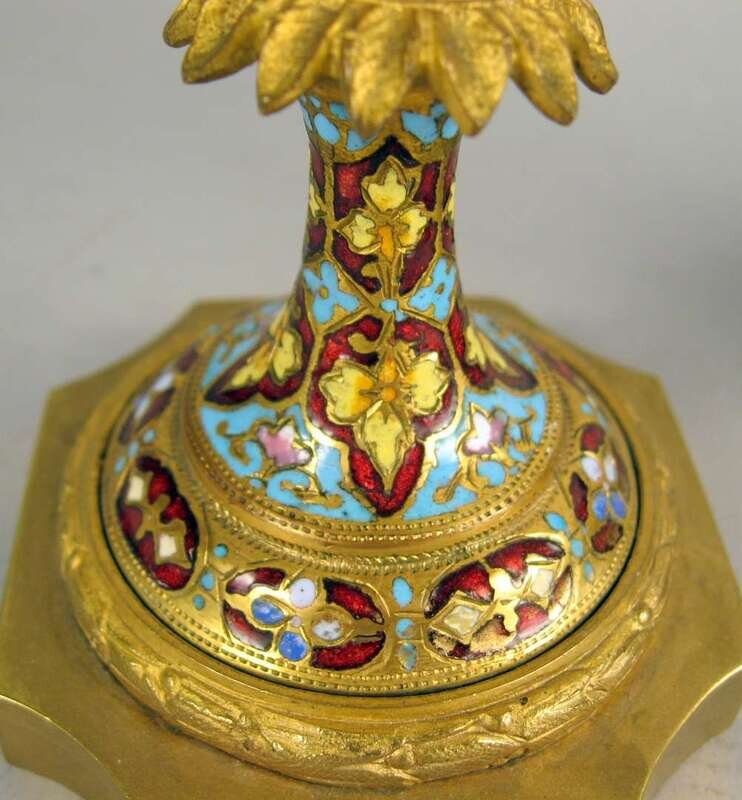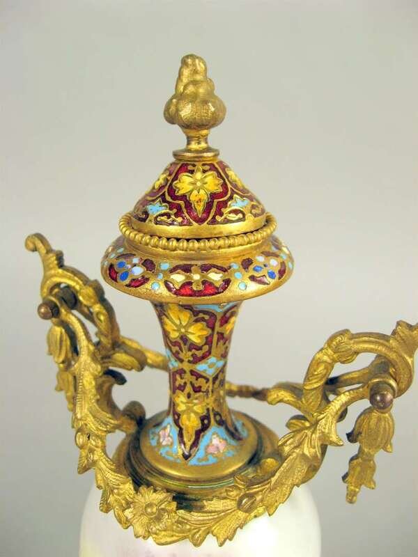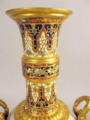 Two French champleve enamel and porcelain urns