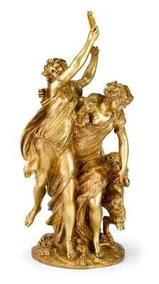 Bronze, gilt patina, modeled as two dancing bacchantes, one holding a tambourine, the other with pipes at her feet and attended by a child satyr, inscribed 'Clodion' and '1762'.