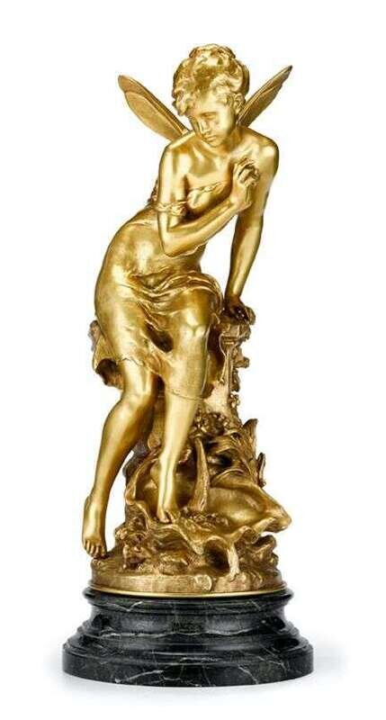 Bronze, gilt patina, modeled as a scantily clad nymph seated on a tree stump, signed 'Math. Moreau' and raised on a circular black marble base.