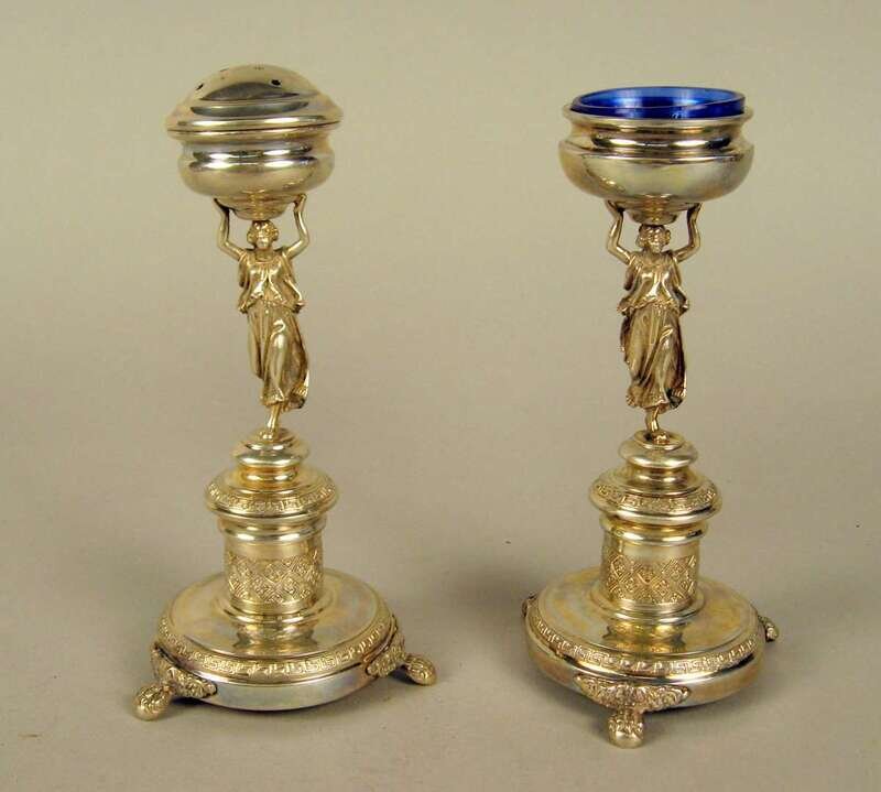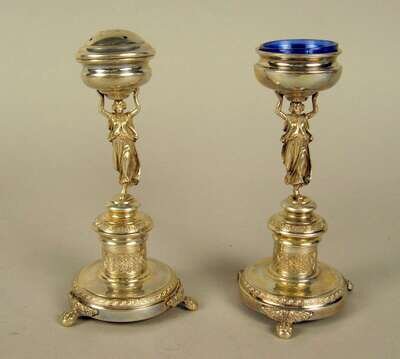 Comprising a pair of Continental silver figural salt and pepper shaker each modeled as a classical woman holding an urn, stamped '800' and a silver canister. (3).
