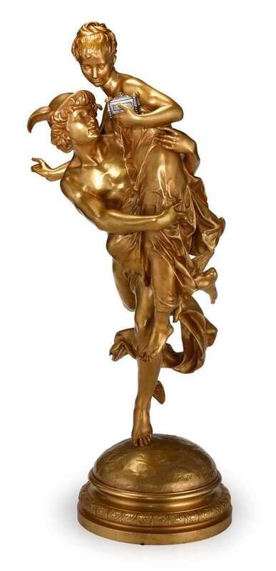 Bronze, gold and silver patinas, modeled as Mercury holding Pandora in his arms while she holds a silver casket, signed 'Faure de Brousse'.