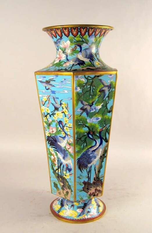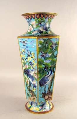 Baluster form with an hexagonal mouth, enameled with egrets and blossoms on a light blue ground.