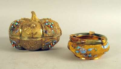 Comprising a melon shaped box with applied hardstone cabochons and foliate enamel and embossed floral panels; and a jade mounted ashtray enameled with exotic birds. (2).