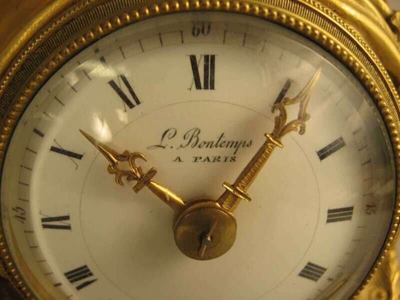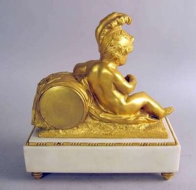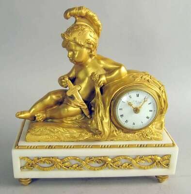 The gilt bronze figure of a seated putto wearing a helmet with a sword in his hand beside a circular white enamel dial inscribed 'L. Bonheur/ A Paris', on a rectangular white marble base with gilt bronze foliate mounts.
