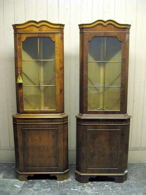 The curved molded cornice over a glazed and mullioned door, the lower section with a single cupboard door, raised on bracket feet. (2).