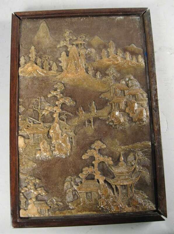 Rectangular, carved in relief depicting Chinese figures in a mountainous landscape.