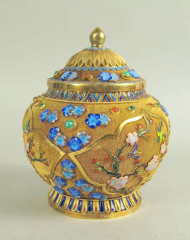 Chinese silver gilt and enamel filigree jar