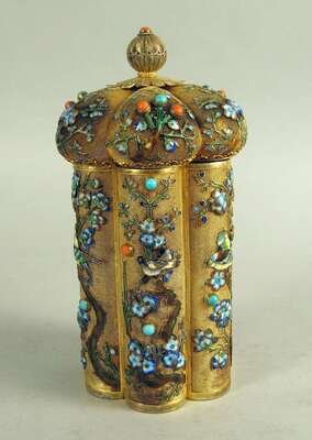 The lobed hexagonal cylindrical body enameled with birds and flowering branches and mounted with hardstone cabochons.