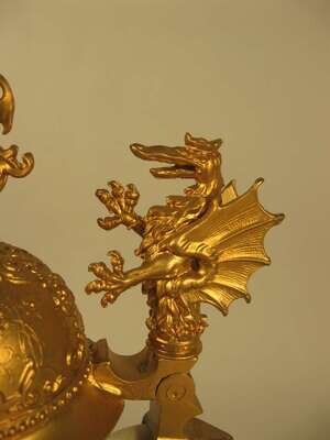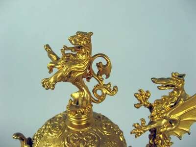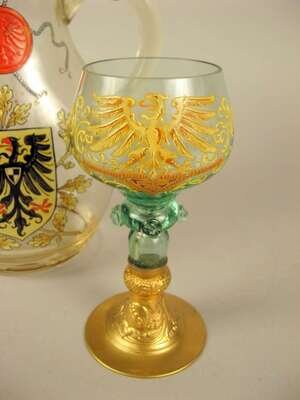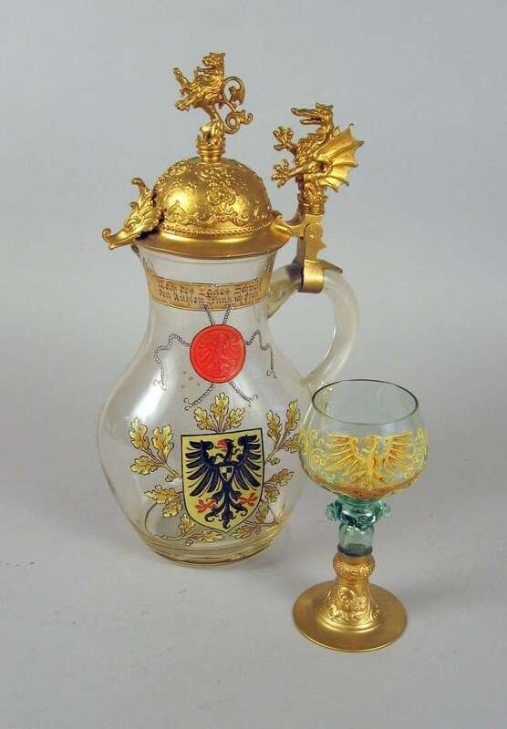 The domed gilt cover with a lion finial and dragon thumbpiece over a clear glass flattened pyriform body with loop handle, enameled with a heraldic shield and inscription; together with an enameled green Bohemian glass goblet. (2).