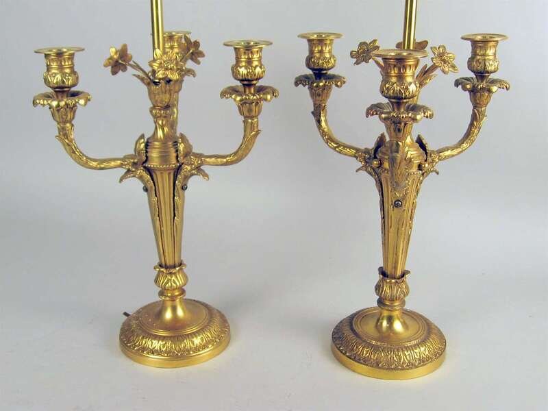 Each with three foliate cast candlearms with flowerheads, on a leaf cast circular base; mounted as lamps. (2).