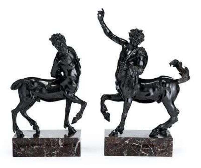 Dark brown patina, each raised on rectangular red marble base. (2).