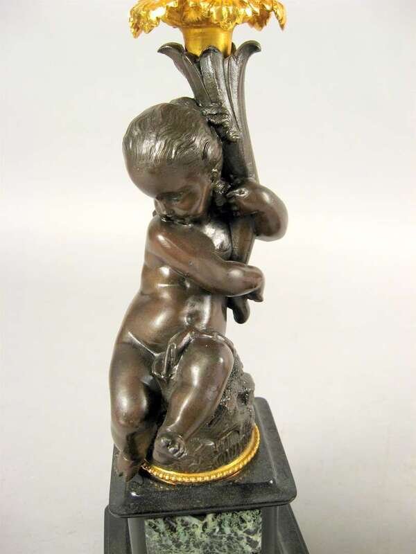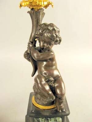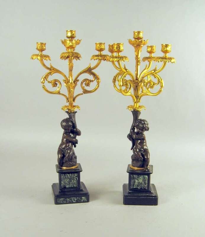 Each modeled with a putto supporting a foliate cast central candlearm issuing four other candlearms, on a marble inset slate base. (2).