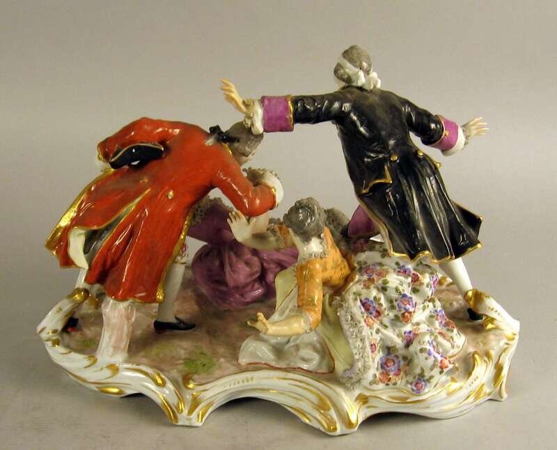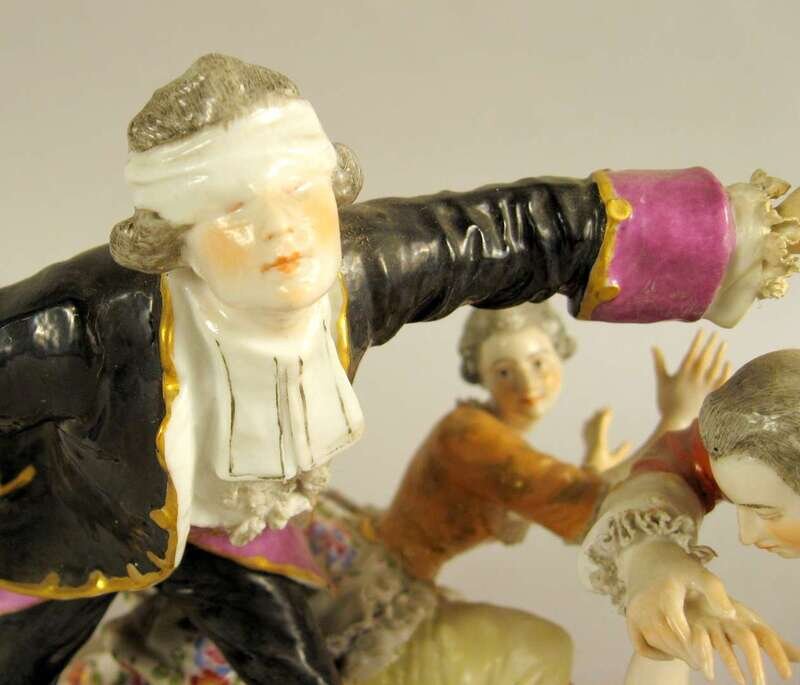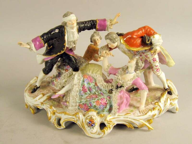 Modeled as four figures in 18th century dress engaged in a game of hide-and-go-seek, on a rococo scroll base, stamped mark to underside.