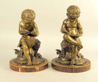 Pair of bronze figures of children, medium brown patina, modeled as a child reading and a child writing, raised on oval rouge marble bases, signed 'Falconet'. (2).
