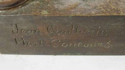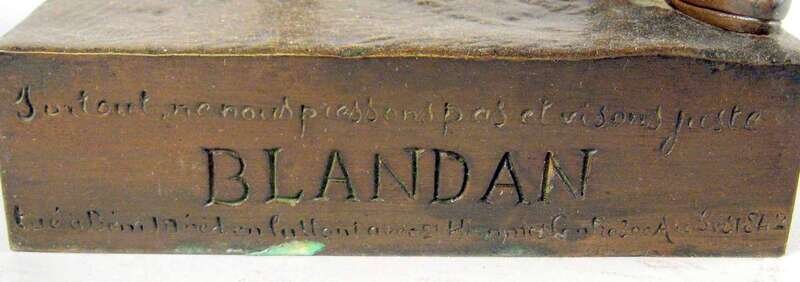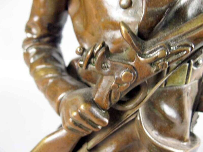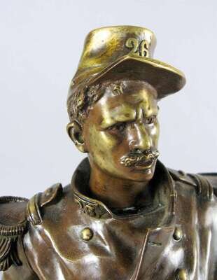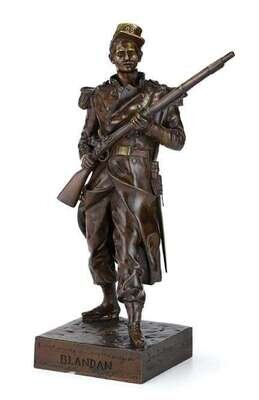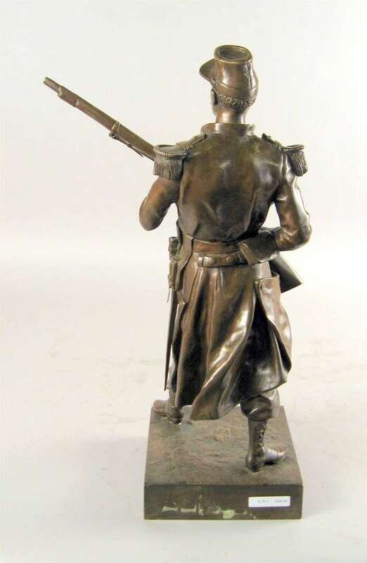 Bronze, medium brown patina, modeled as French soldier, on a square base, the base inscribed 'Surtout ne nou pressons pas et visons juste tu e a beni mered et luttant avec 21 homees contre 300 1842' and 'Jean Gautherin/ Hors Concours'.