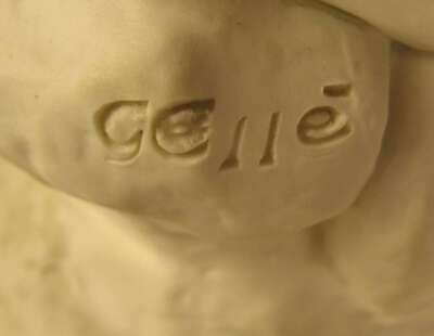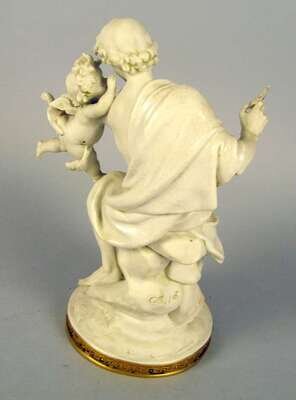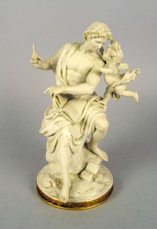 Modeled as a seated classical male figure attended by putti, inscribed marks.