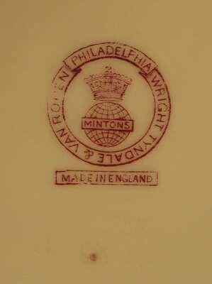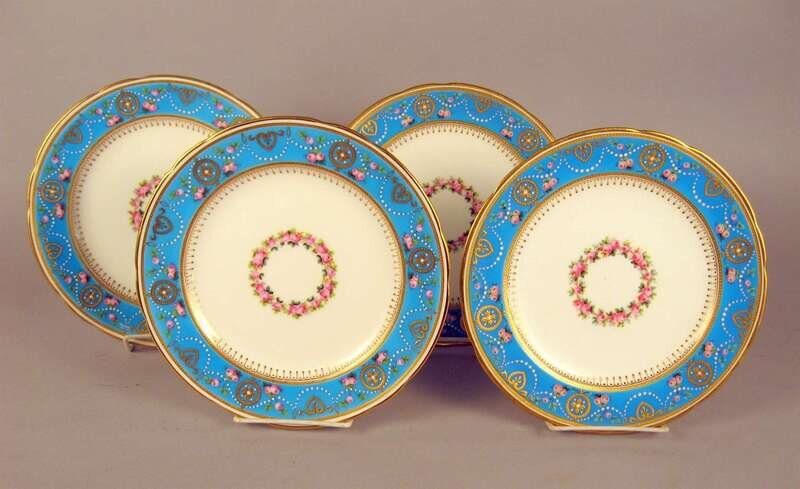 Each with a plain center, the border with beaded swags and pink roses on a light blue ground with gilt details, printed puce 'Mintons' mark to reverse. (4).