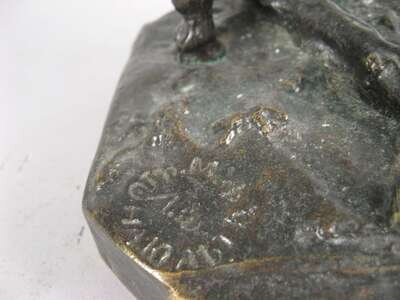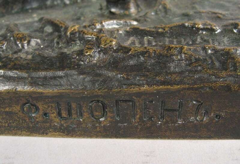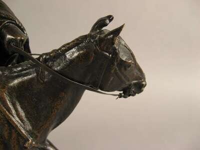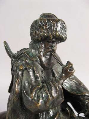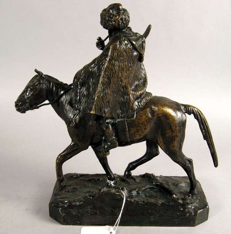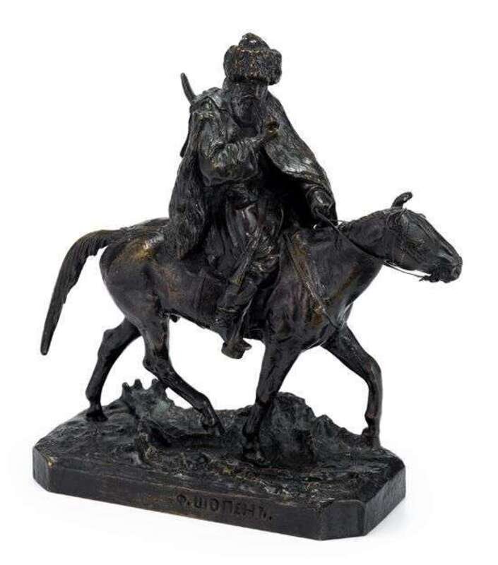Bronze, green-brown patina, modeled as a cossack smoking a pipe on horseback, raised on a naturalistic base, inscribed in Cyrillic, with Chopin foundry mark.