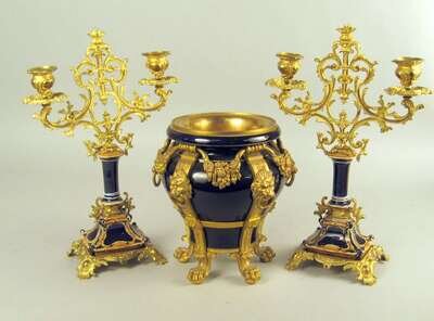 Comprising a blue glazed jardiniere and a pair of candelabra; the jardiniere with vertical gilt bronze bands mounted with lions' head ring handles, raised on paw feet, the candelabra with three foliate cast candlearms and raised on a scrolled base. (3).