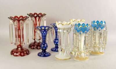 Comprising a pair of cobalt cut-to-clear, a pair of opaline, a pair of ruby cut to clear, and a pair of opaline and blue; all hung with prisms. (8).