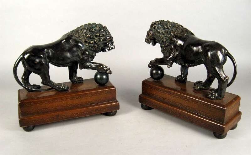 Bronze, brown-gold patinas, each modeled standing with a front paw resting on an orb, raised on leather covered plinth base. (2).