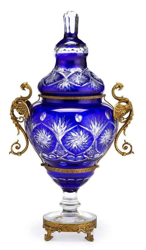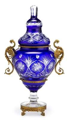 The body with cut star patterns and gilt metal scrolling winged lion handles, on a turned clear stem and circular foot raised on gilt metal shell feet.