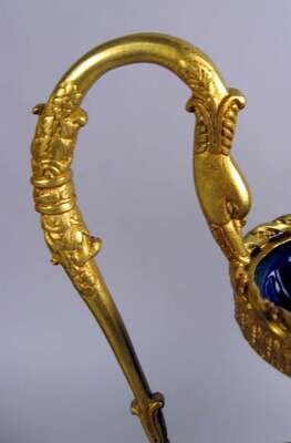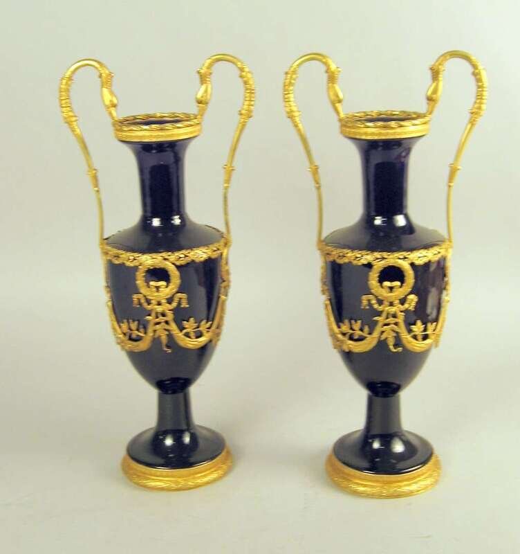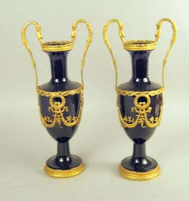Pair of neoclassical style gilt metal mounted cobalt glass urns