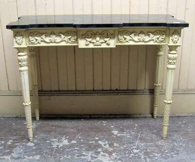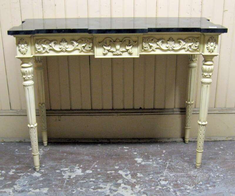 The breakfront black faux marble top over a cream painted and scroll carved frieze drawer raised on tapered fluted and foliate carved legs.