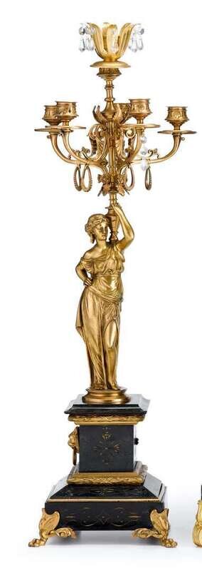 Each standard modeled as a classical female issuing five curved candlearms, on a carved slate square base raised on foliate cast paw feet. (2).