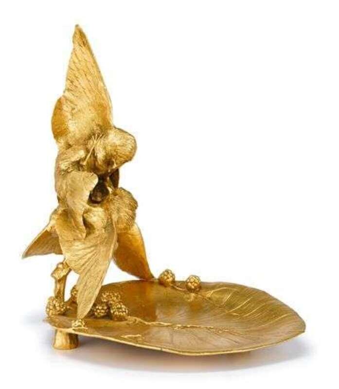 Bronze, gold patina, modeled as a pair of birds over a leaf and berry tray.