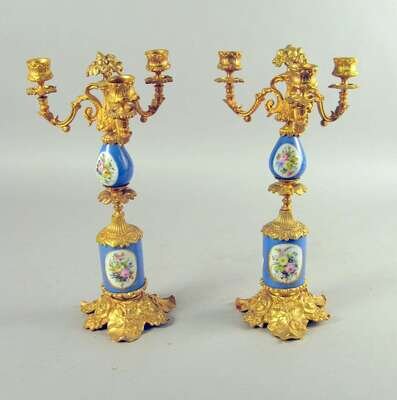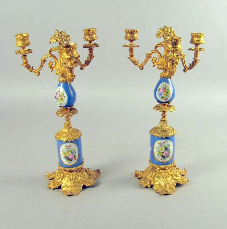 Each with three foliate cast candlearms above a porcelain standard painted with reserves of floral bouquets on a blue ground, raised on scrolled feet.
