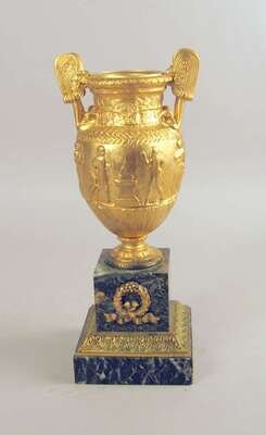 The twin handle urn with a figural relief molded waist, above a square green marble pedestal base.