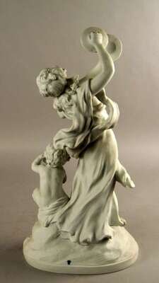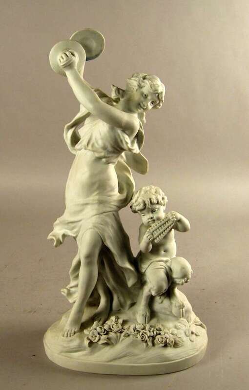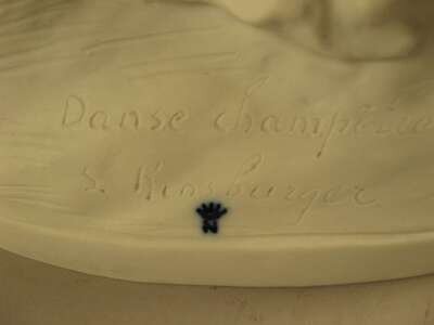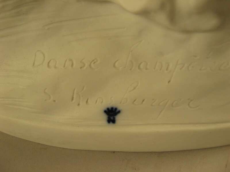 Modeled as a dancing bacchante attended by a putto playing a flute, inscribed 'danse chametre/ S. Kingsburger' and with blue crowned 'N' mark.