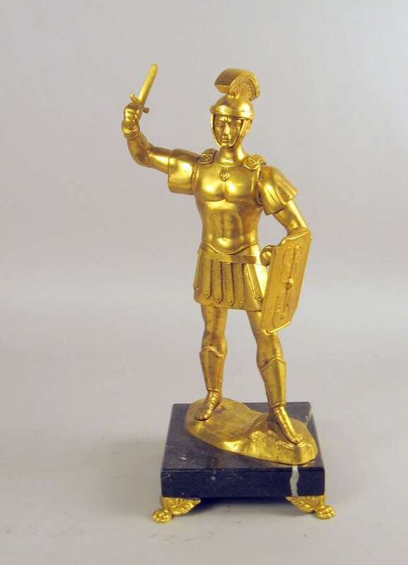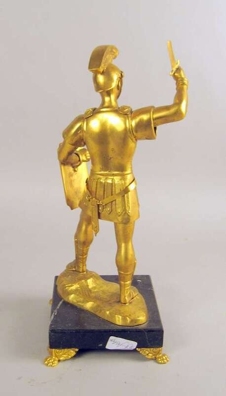 Modeled as a Roman soldier, a sword in one hand and shield in the other, raised on a square black marble base and winged paw feet.