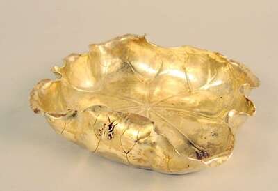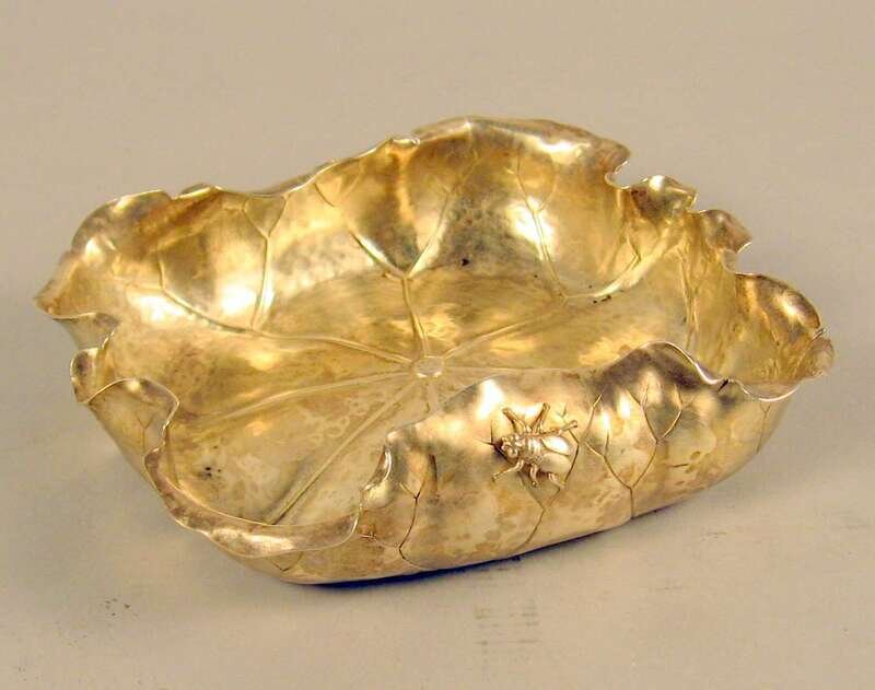 Formed as a leaf, with applied silver insects, stamped marks to underside.