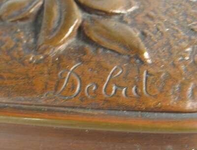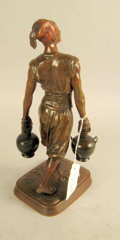 Bronze, red and brown patinas, modeled as a North African water carrier, the base with a plaque inscribed 'Prix de Rome' and signed Debut with Paris foundry seal.