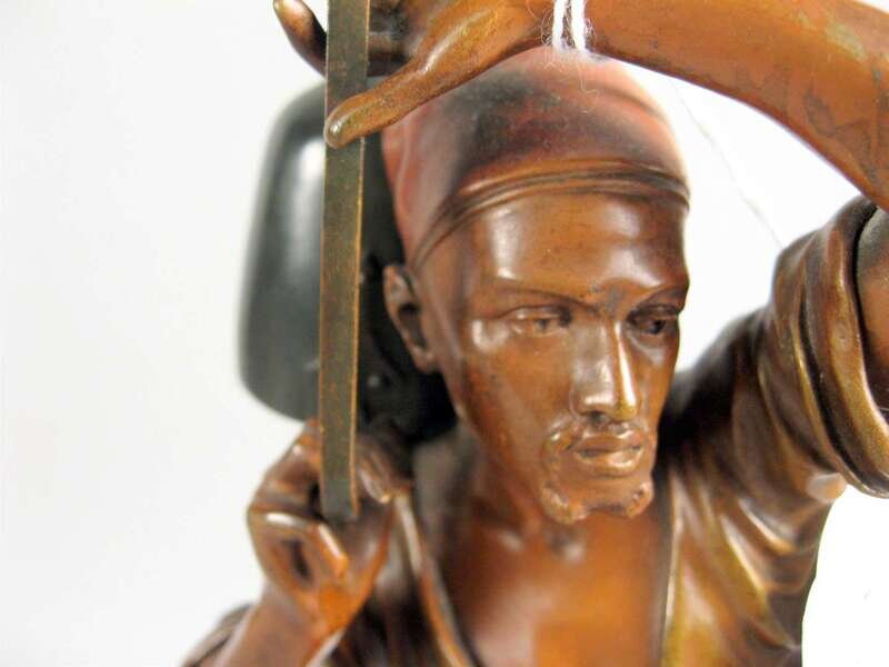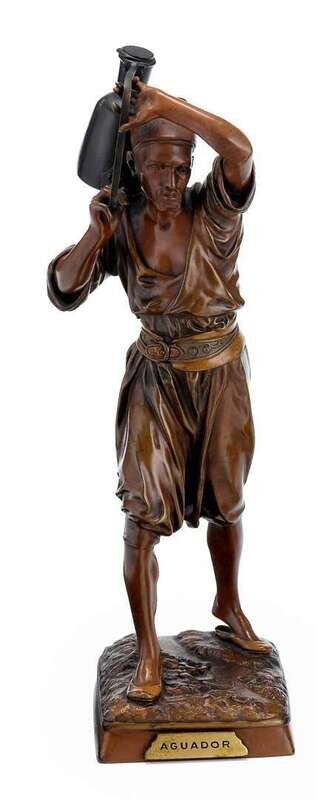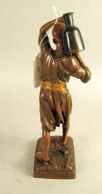 Bronze, orange and brown patinas, modeled as a North African carrying a waterjug over his shoulder, on a naturalistic base, the front bearing a plaque 'Aguador'.