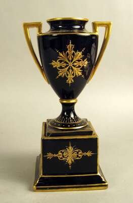 With angled gilt handles on a cobalt ground with gilt details, blue beehive mark.