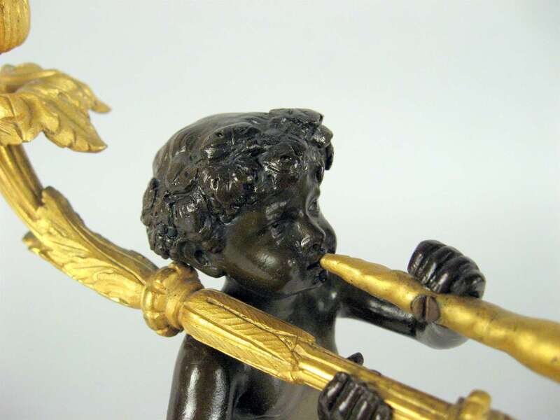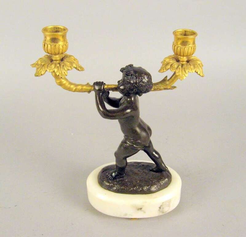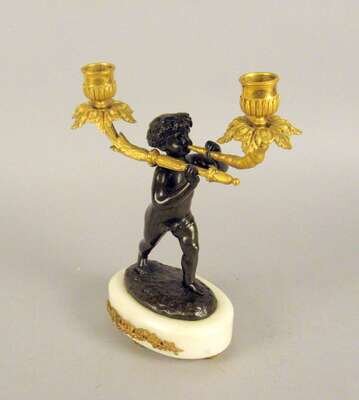 The central patinated figure of a putto holding two candlearms, raised on a gilt metal mounted marble base.