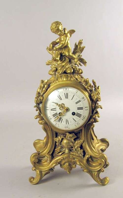 With a gilt bronze figure of a putto surmounting the case with a white circular enamel Arabic numeral dial, raised on a c-scroll rococo base.