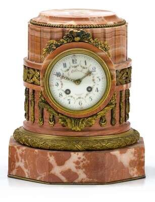 The circular white and floral painted enamel Arabic numeral dial set in pink marble reeded column case mounted with ribbon tied foliate sprigs, on an octagonal base.