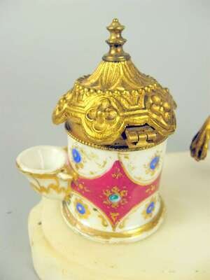 Continental gilt bronze, porcelain and marble inkstand
