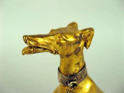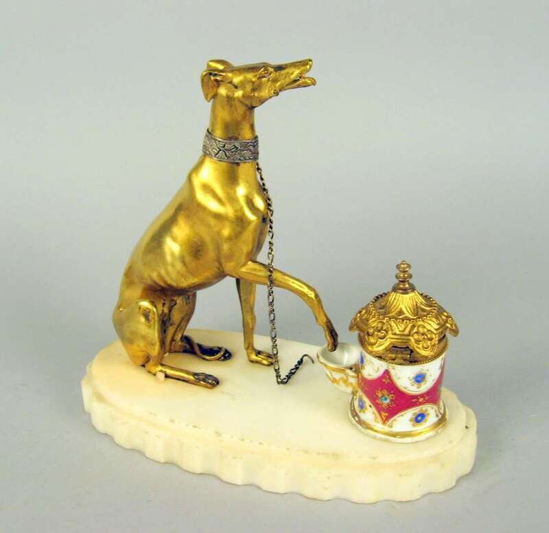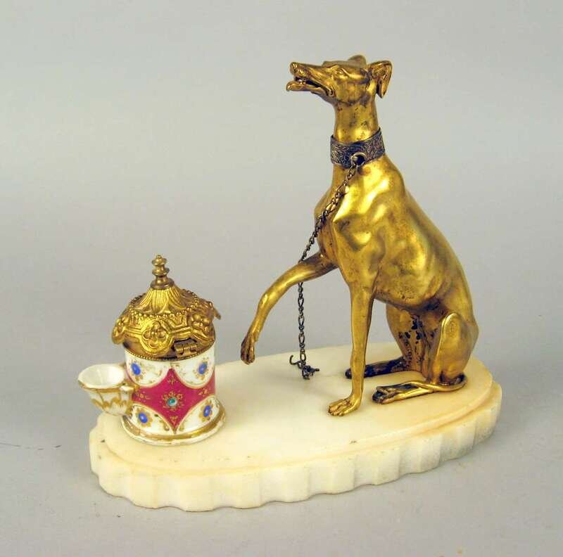 The gilt bronze figure of a seated greyhound beside a porcelain inkpot with hinged lid on an oval white marble base.