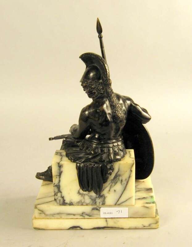 Dark brown patinated, the seated figure in military garb holding a spear, on a white and black veined marble base inscribed 'AJAX'.
