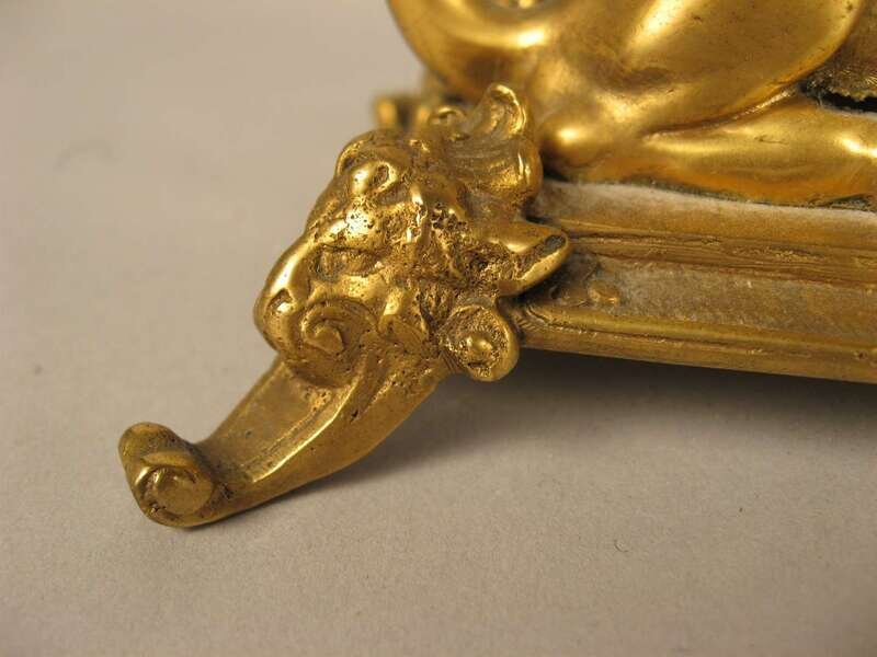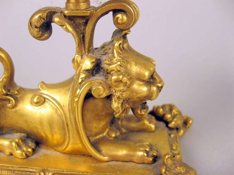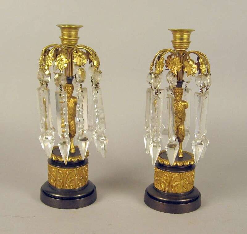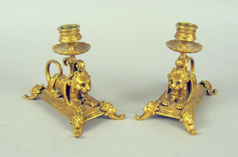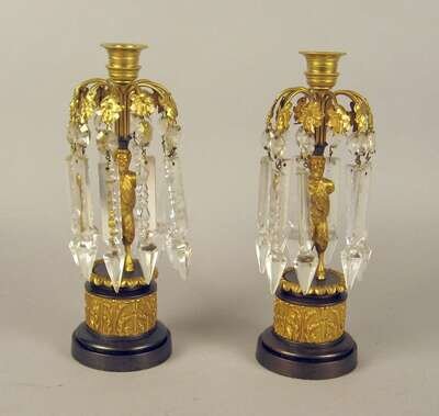 The first pair with satyr figural stems hung with prisms on a patinated and gilt foliate column pedestal base; the other pair modeled as recumbent lions, stamped 'DD' to underside. (4).