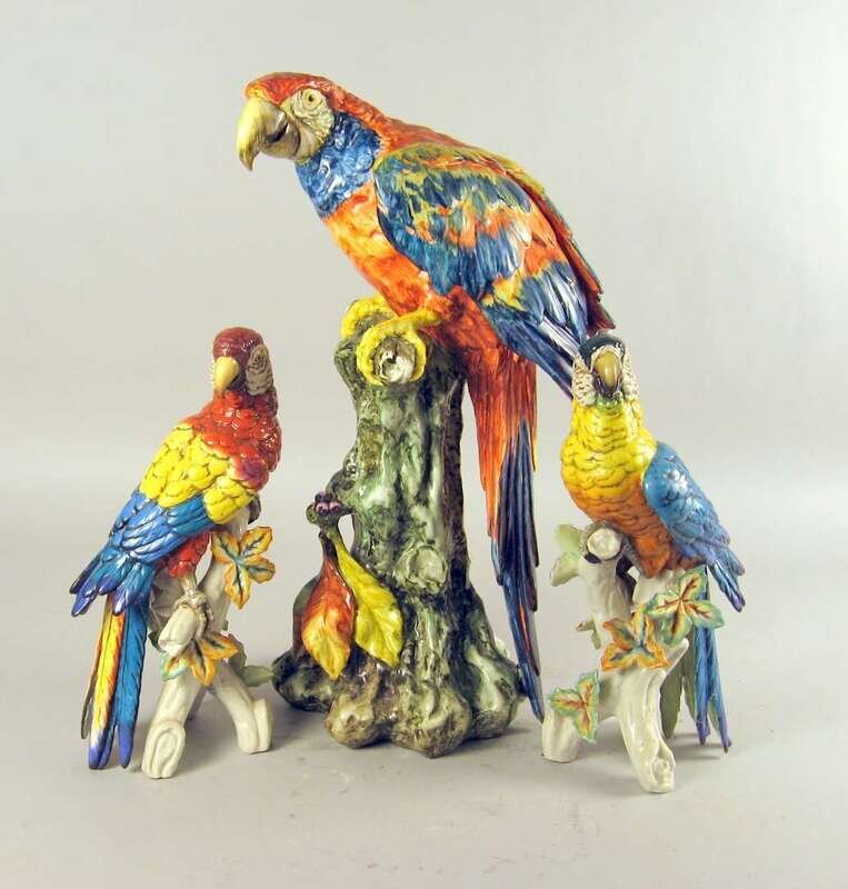 Modeled perched on branches, glazed in vibrant hues; two marked made in Spain. (3).