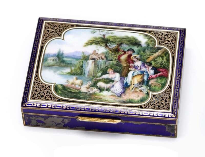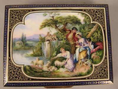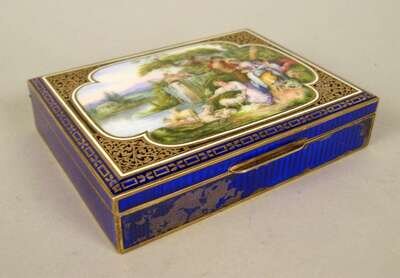 Rectangular, the cover centered by a painted reserve depicting a pastoral scene of figures by a lake, enclosed by pierced foliate spandrels, on a blue enamel ground with gilt accents, stamped 'sterling' and 'KF'.