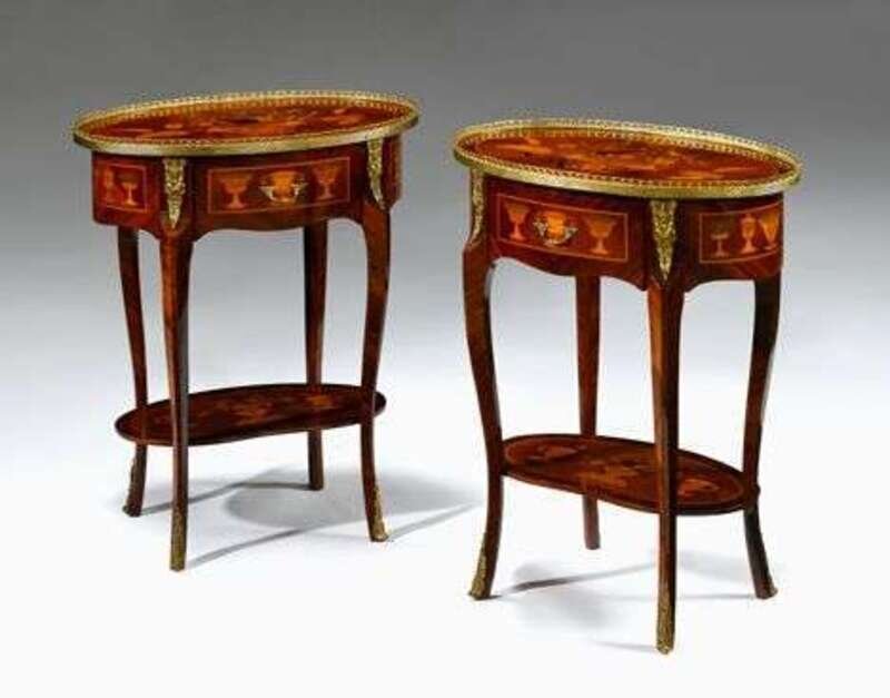 Pair of Louis XV style marquetry tables a chiffonier in the manner of charles topino