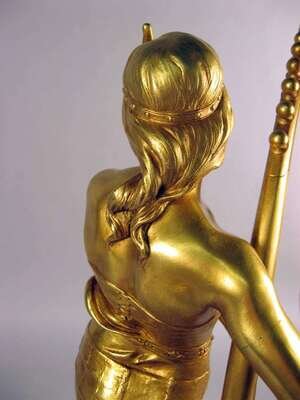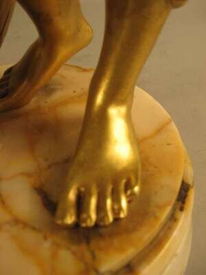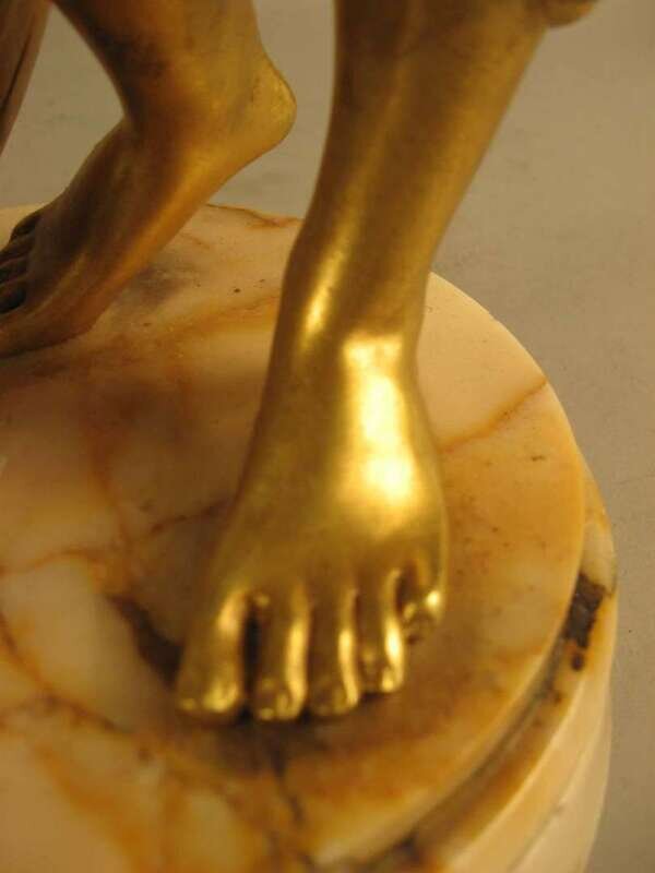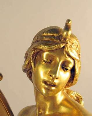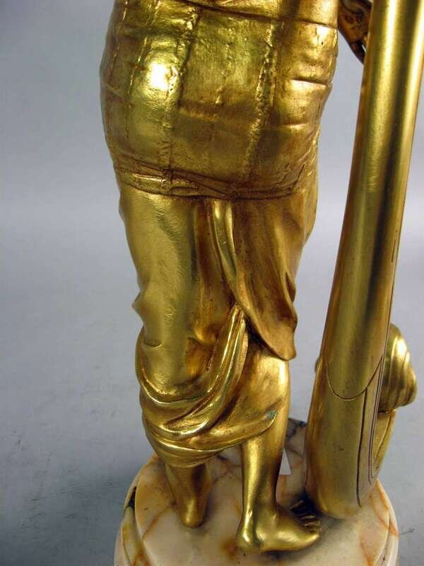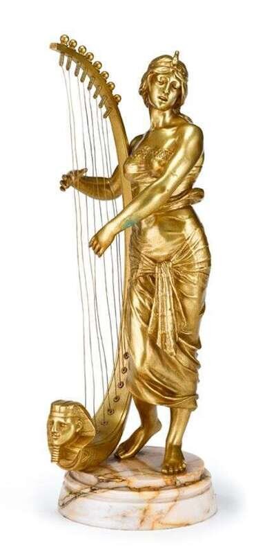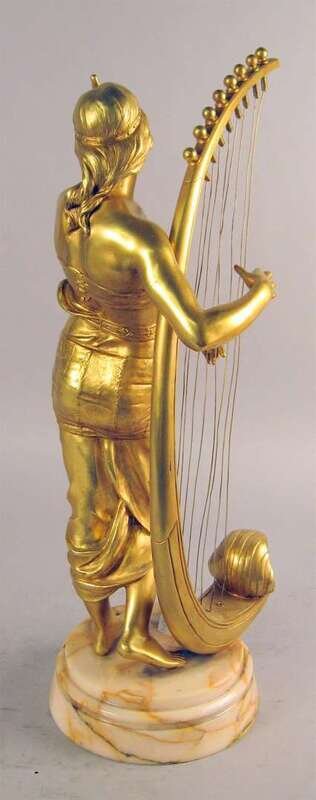 Modeled as a young woman in Middle Eastern dress playing a harp, raised on a circular orange veined marble base.