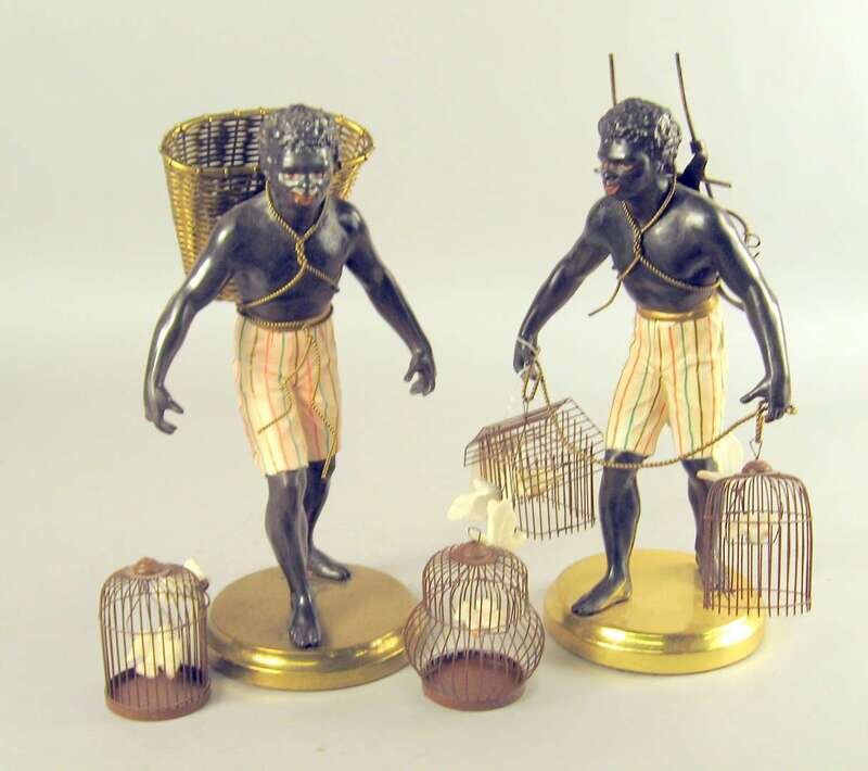 Each standing holding free-swinging baskets holding birds, raised on an oval base. (2).